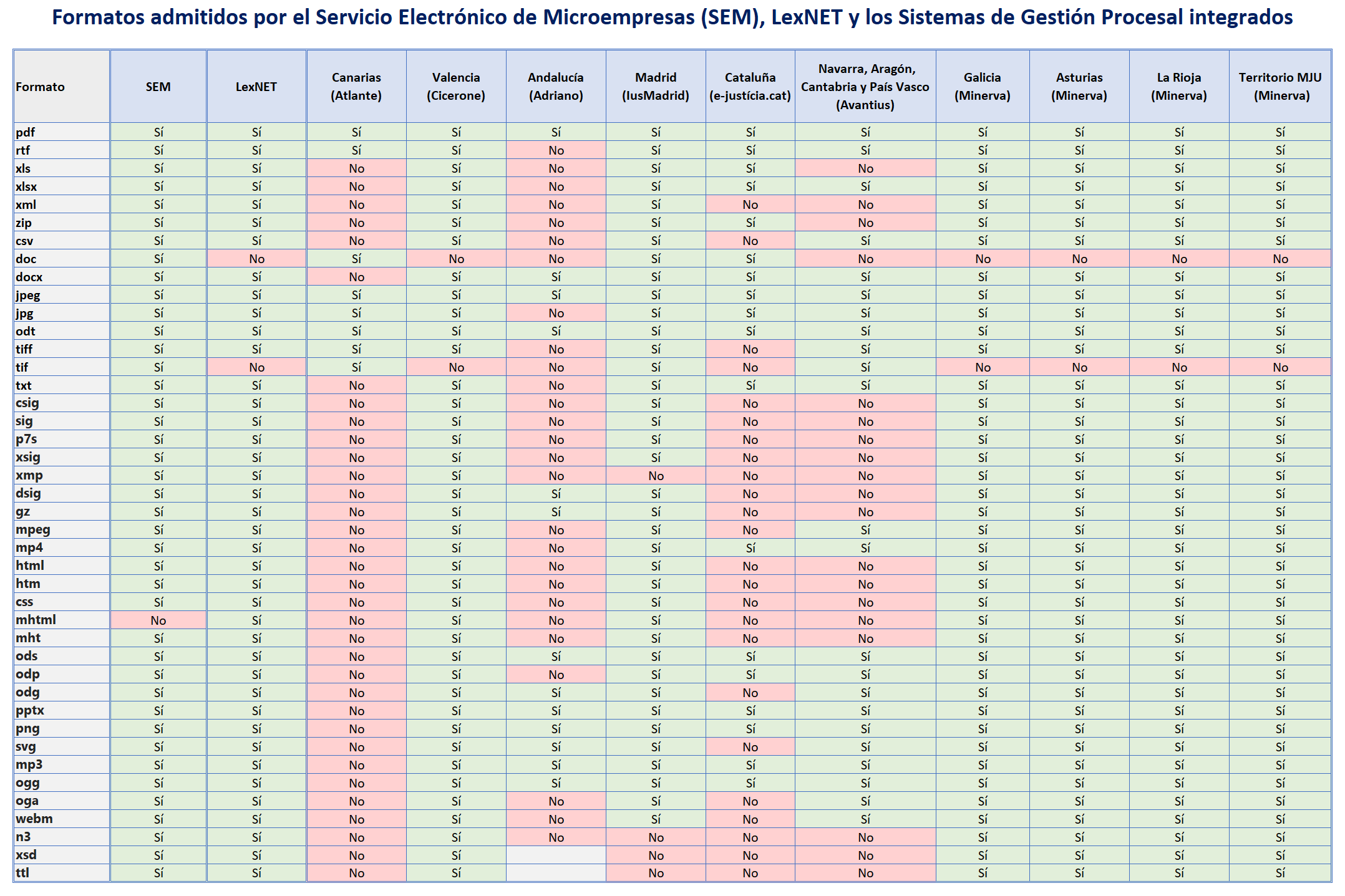 El servicio actualmente admite casi todos los formatos, no obstante, y a modo orientativo, deberá tener en cuenta los formatos de recepción de archivos admitidos por los Sistemas de Gestión Procesal integrados a la hora de la remisión de la documentación y archivos, como se muestra en la siguiente tabla ilustrativa.