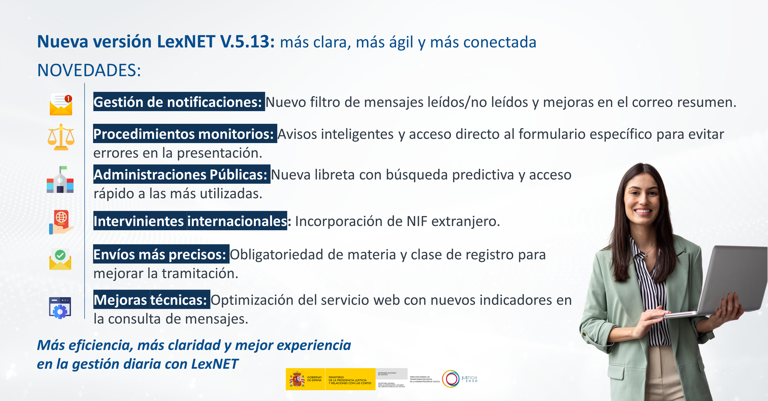La nueva versión 5.13 de LexNET introduce importantes avances orientados a mejorar la experiencia de los profesionales, optimizar la gestión de notificaciones y reforzar la correcta tramitación de procedimientos judiciales.