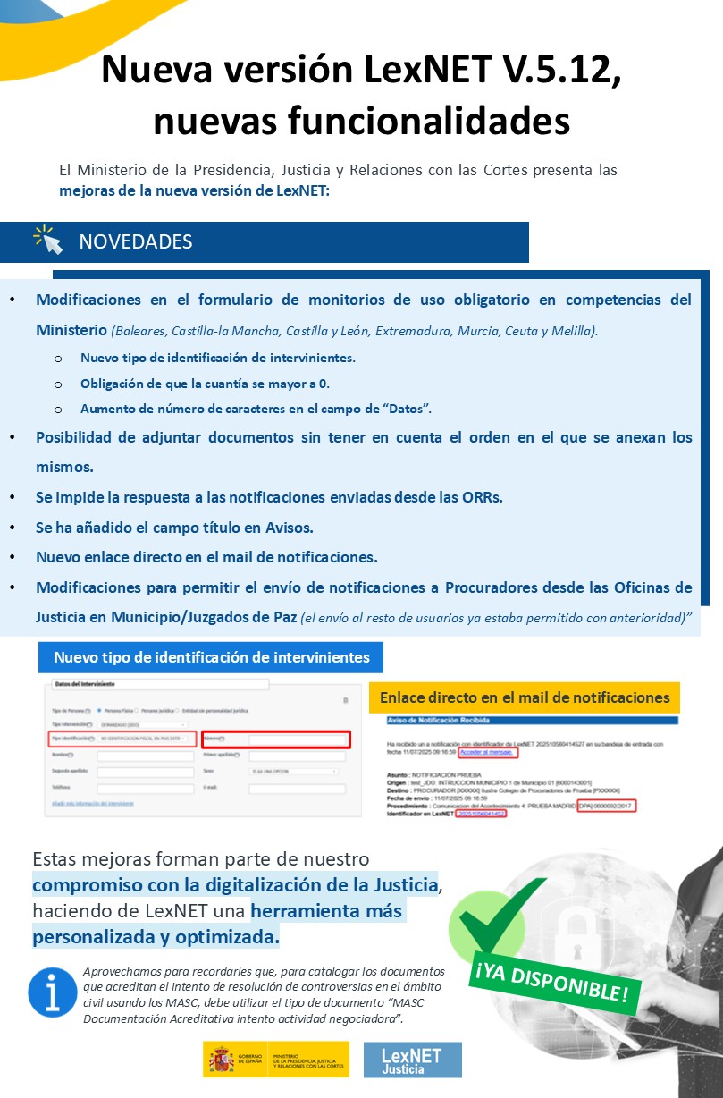 Desde el Ministerio de la Presidencia, Justicia y Relaciones con las Cortes estamos comprometidos a continuamente revisar y optimizar todas aquellas aplicaciones que ayuden a la digitalización de la justicia. Por ello, se ha trabajado en la versión 5.12 de LexNET, la plataforma digital clave para la comunicación entre operadores jurídicos y órganos judiciales. Esta actualización trae mejoras en las funcionalidades tanto de la interfaz web como de los servicios web.